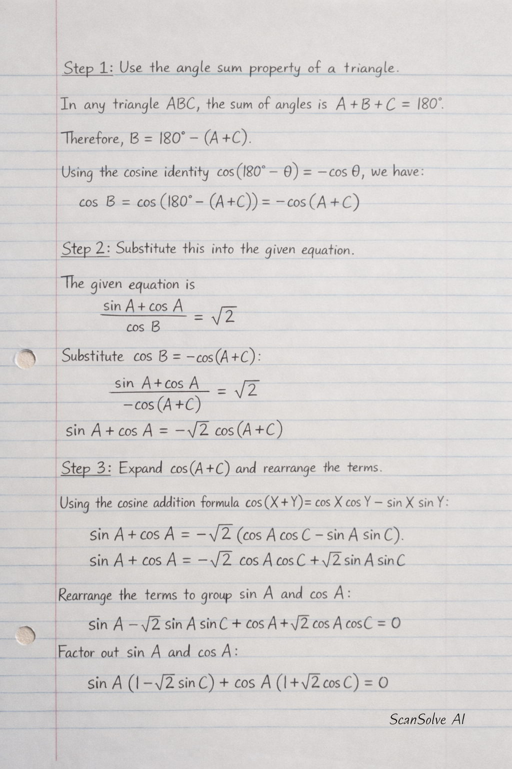 Step 3: Expand cos(A+C) and rearrange the terms.