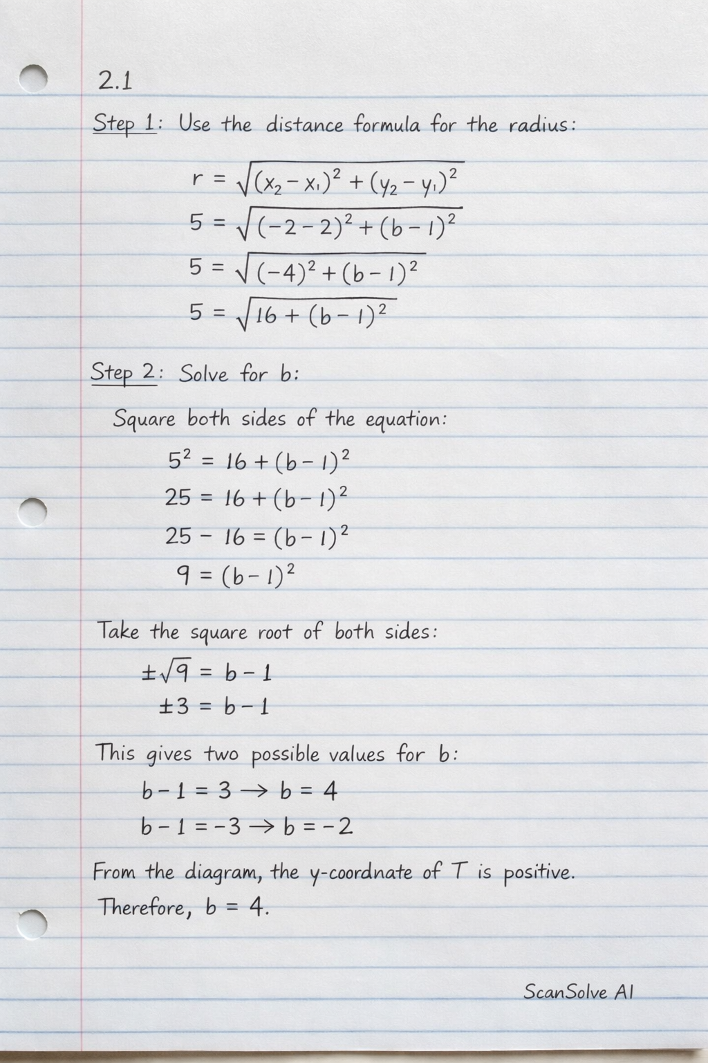 $$5 = \sqrt{(-4)^2 + (b-1)^2}$$