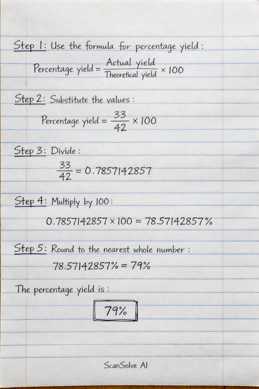 From the image, the actual yield is 33 and the theoretical yield is 42.
