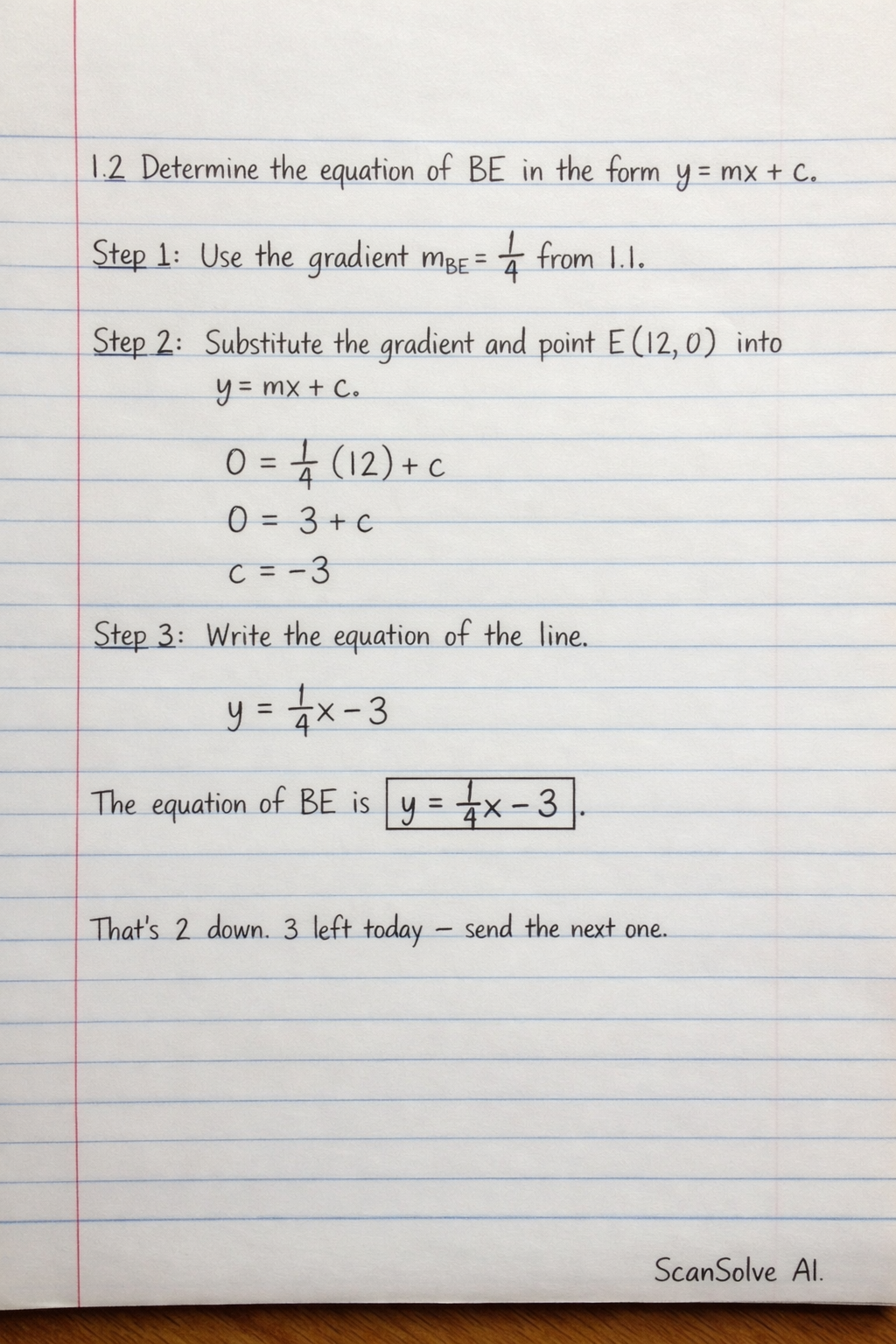 Step 2: Substitute the gradient and one of the points on BE, for example E(12;0), into the equation y=mx+c.