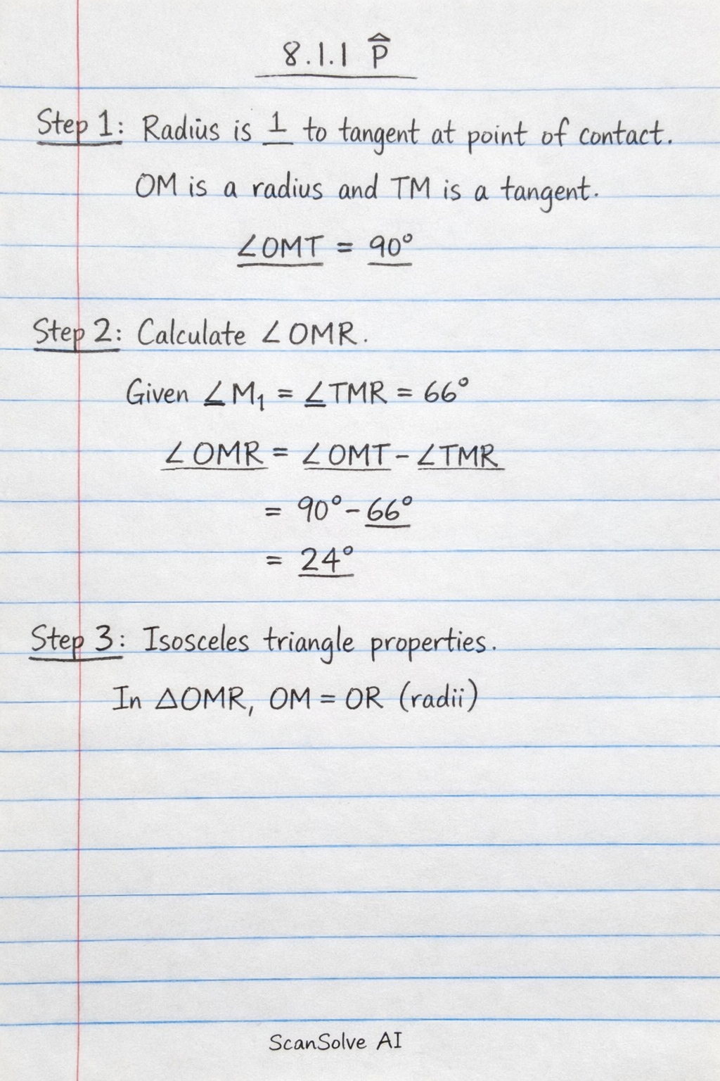 8.1.1 Step 1: Use the property that the radius is perpendicular to the tangent at the point of contact. OM is a radius and TM is a tangent. Step 2: Calculate . Given . Step 3: Use the properties of an isosceles triangle. In , OM = OR (radii of