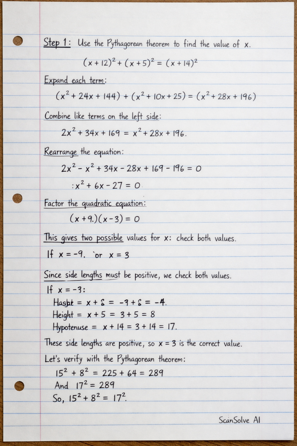Step 1: Use the Pythagorean theorem to find the value of x.