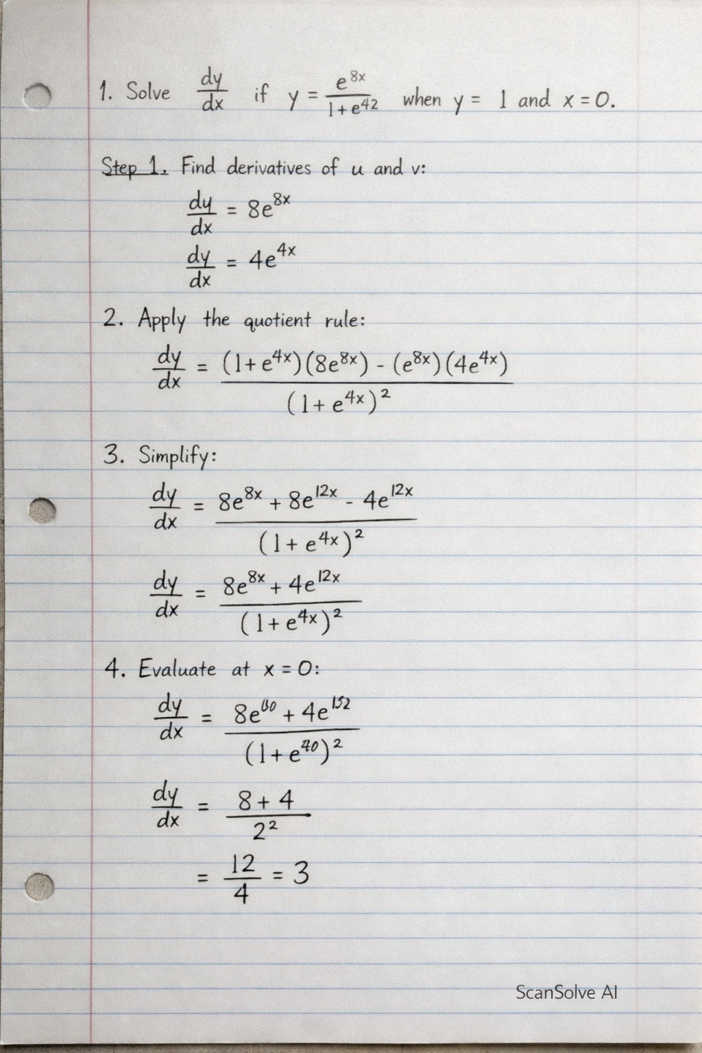 1. Solve $\frac{dy}{dx}$ if $y = \frac{e^{8x}}{1+e^{4x}}$ when $y=1$ and $x=0$.