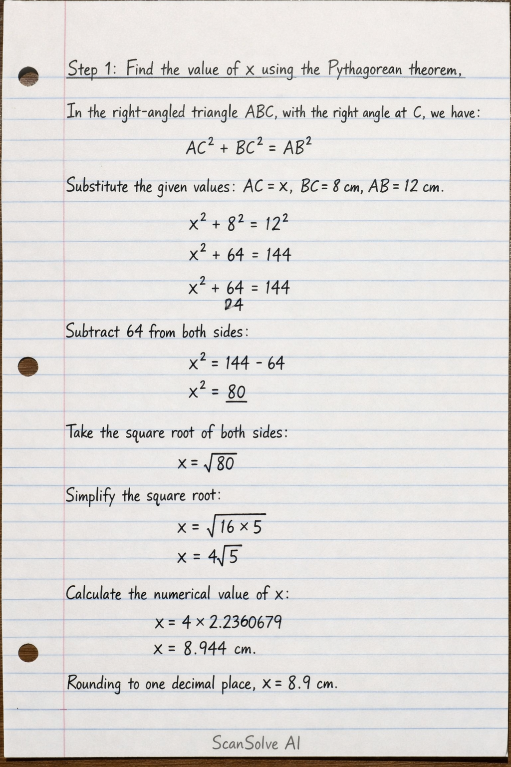Substitute the given values: AC=x, BC=8 cm, AB=12 cm.