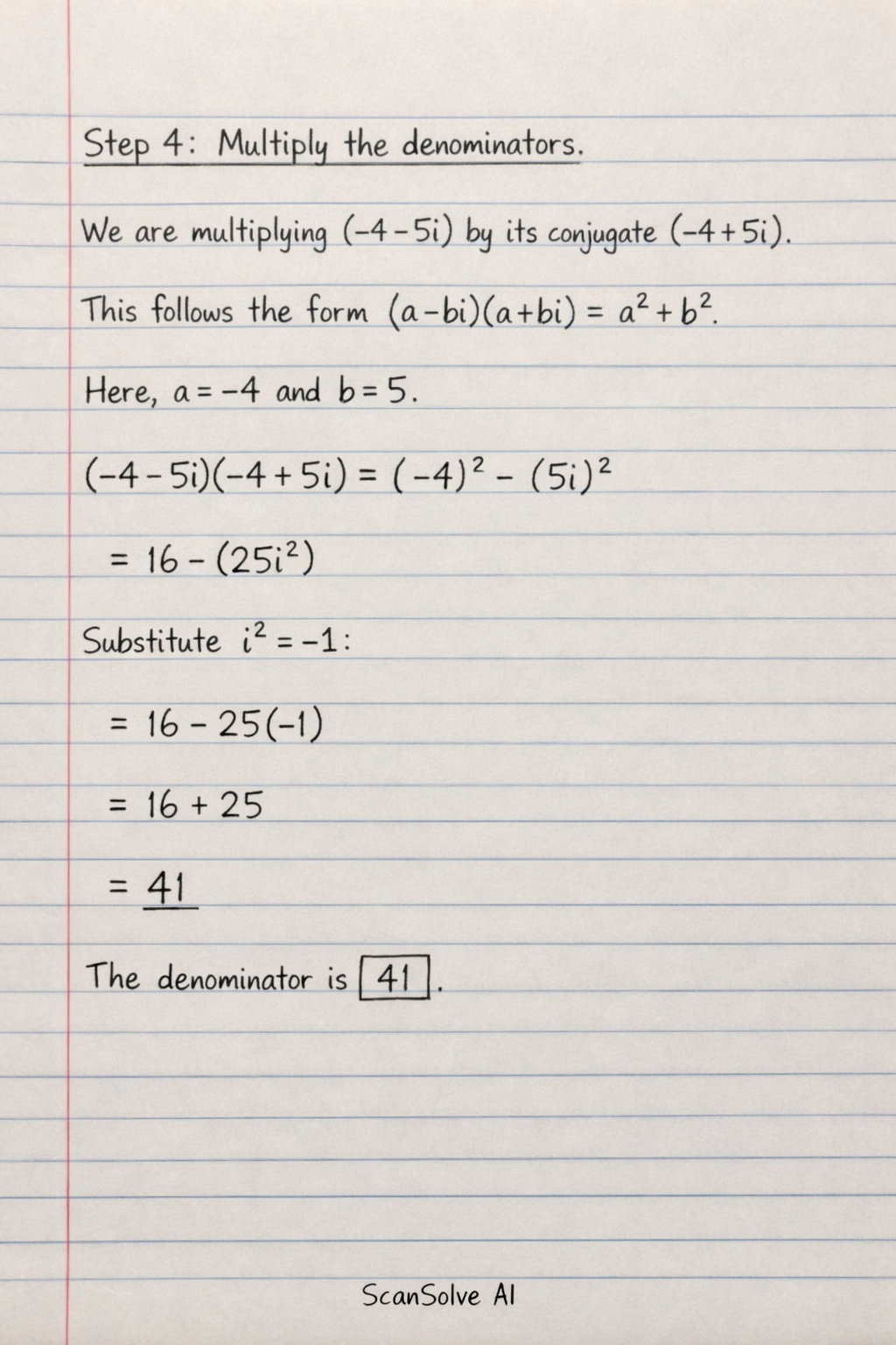 $$ (-4-5i)(-4+5i) = (-4)^2 - (5i)^2 $$
