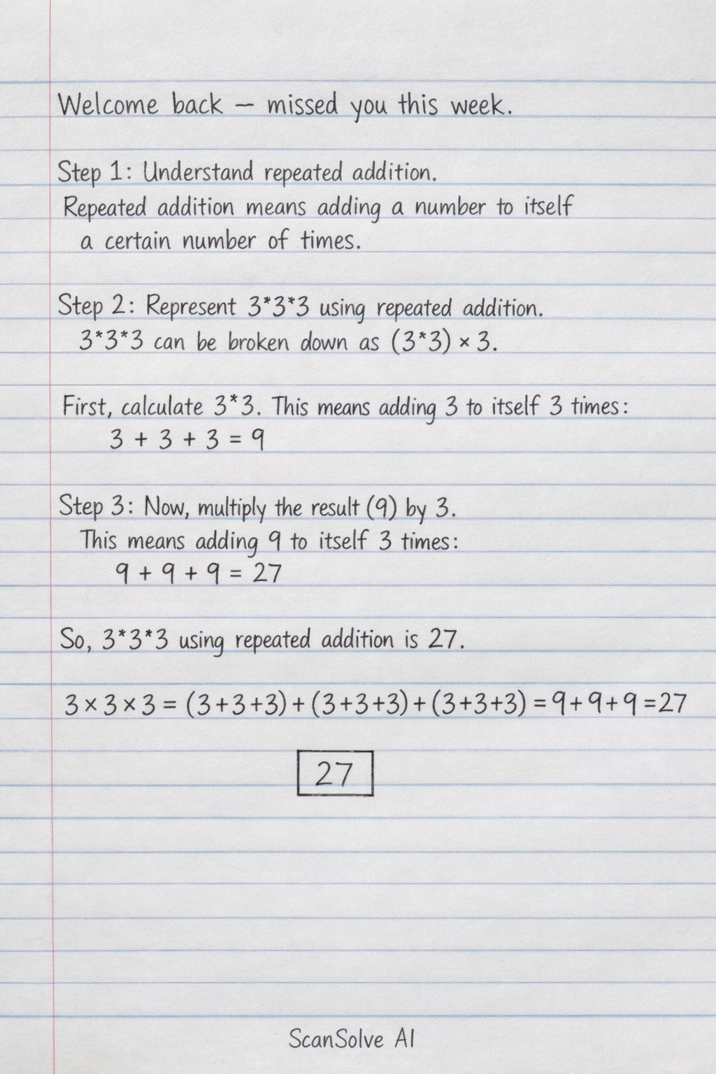 3×3×3=(3+3+3)+(3+3+3)+(3+3+3)=9+9+9=27