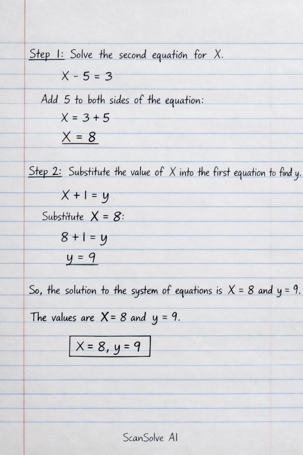 X plus 1 =y X-5=3