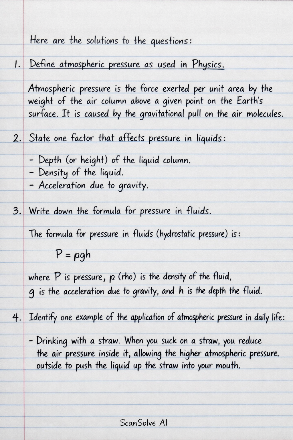 Write down the formula for pressure in fluids.