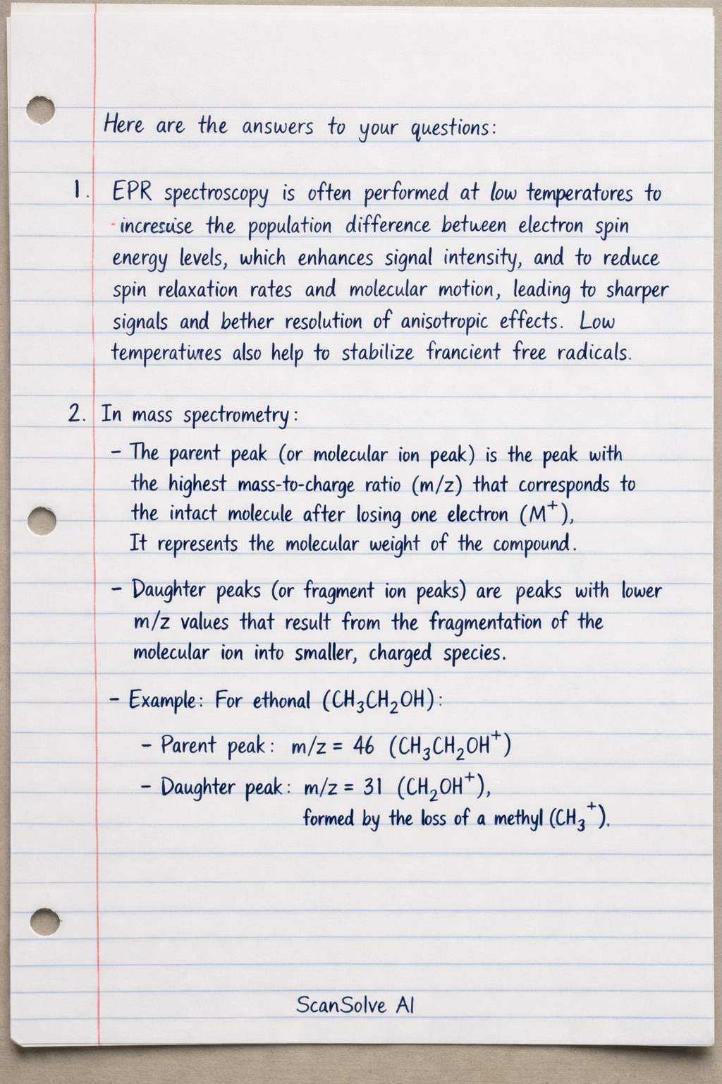 1. EPR spectroscopy is often performed at low temperatures to increase the population difference between electron spin energy levels, which enhances signal intensity, and to reduce spin relaxation rates and molecular motion, leading to sharper signals and better resolution of anisotropic effects. Low temperatures also help to stabilize transient free radicals.