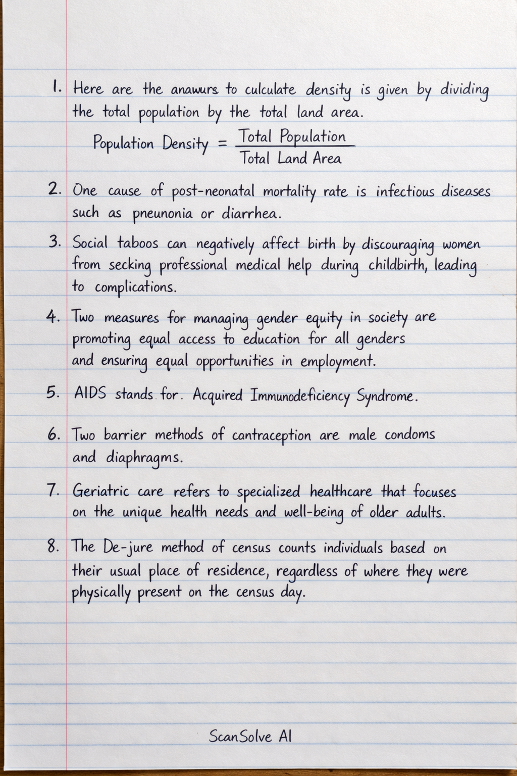 1. The formula to calculate population density is given by dividing the total population by the total land area.