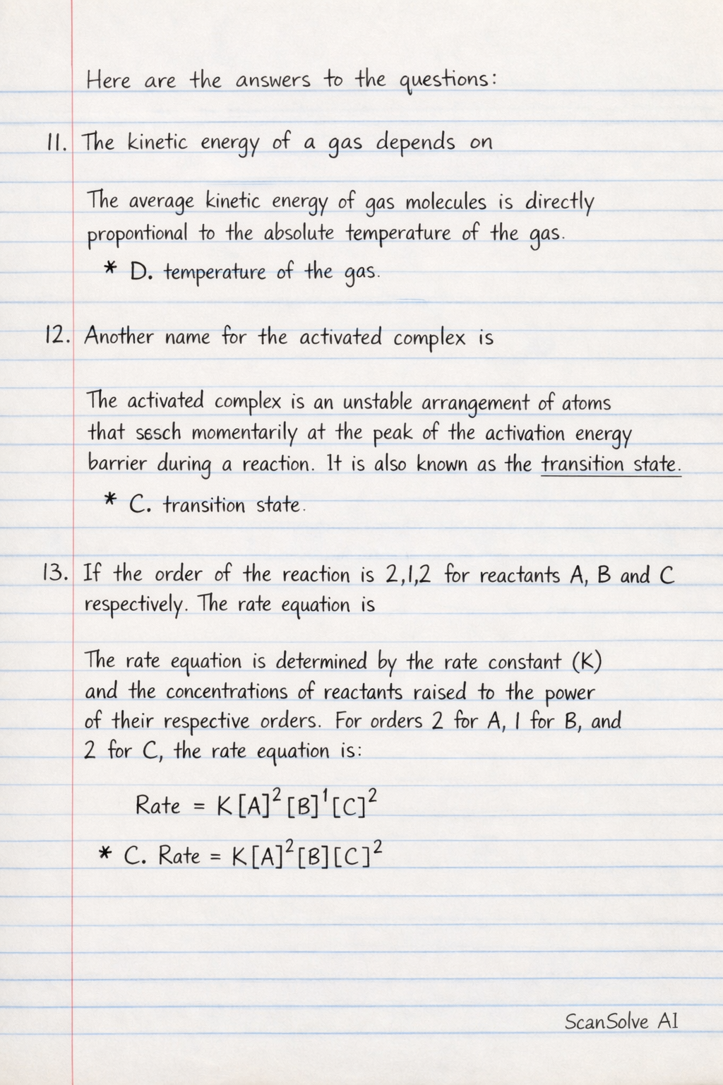 13. If the order of the reaction is 2,1,2 for reactants A, B and C respectively. The rate equation is The rate equation is determined by the rate constant () and the concentrations of reactants raised to the power of their respective orders. For orders 2 for A, 1 for B, and 2 for C, the rate equation is: