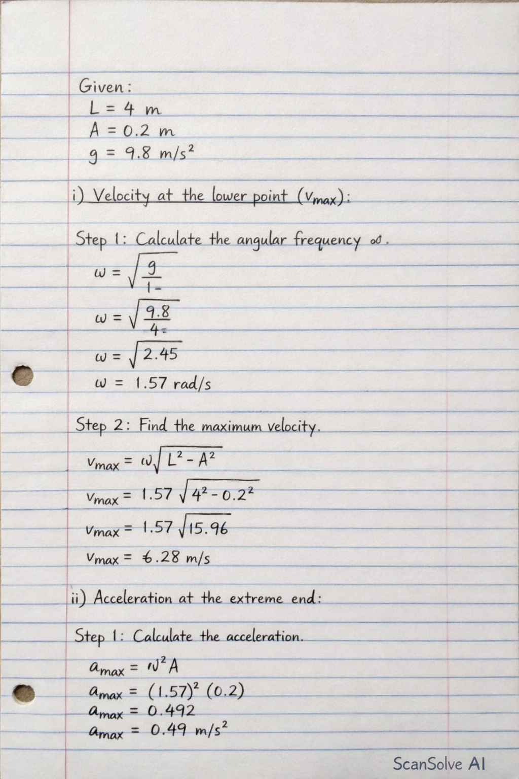 14. A simple pendulum 4 m long swings with an amplitude of 0.2m. Compute the velocity of the pendulum at its lower point and its acceleration at extreme end.