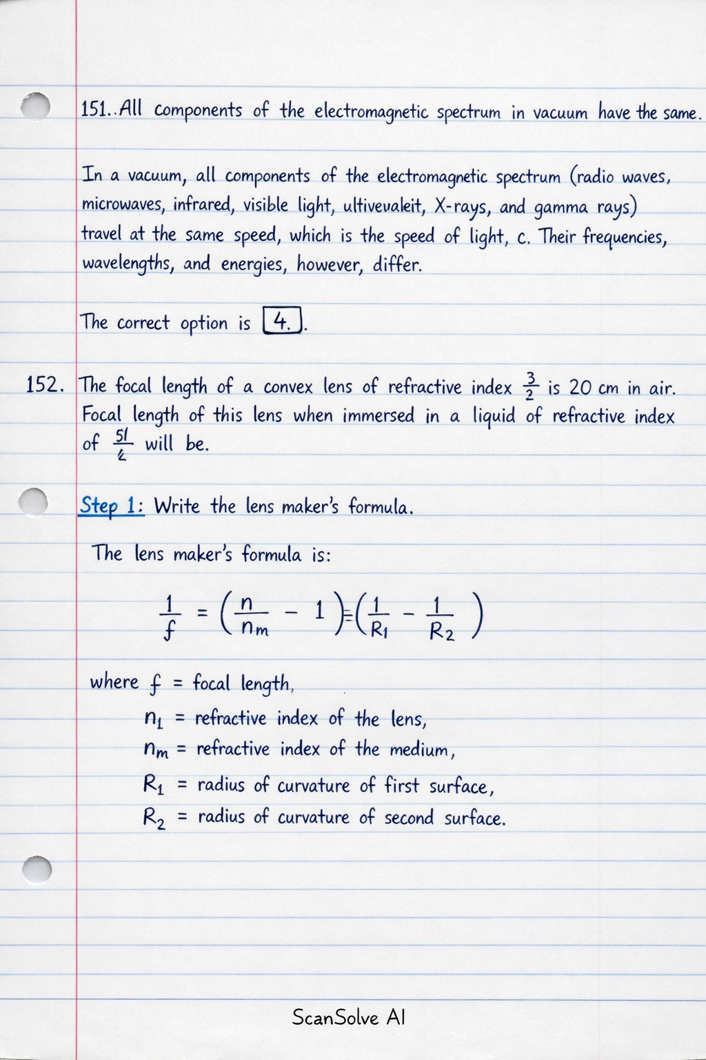 152. The focal length of a convex lens of refractive index 23 is 20 cm in air. Focal length of this lens when immersed in a liquid of refractive index of 25 will be