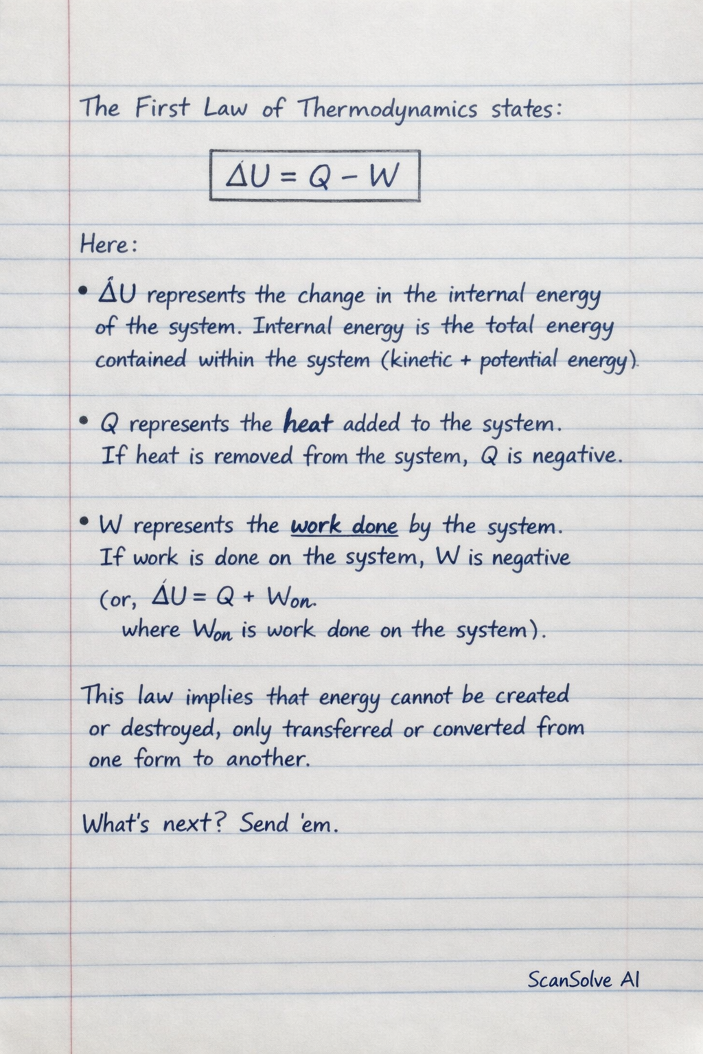 Here: • represents the change in the internal energy of the system. Internal energy is the total energy contained within a thermodynamic system, including the kinetic and potential energies of its molecules. • represents the heat added to the system. If heat is removed from the system, is negative. • represents the work done by the system. If work is done on the system, is negative (or the equation can be written as , where is work done on the system).