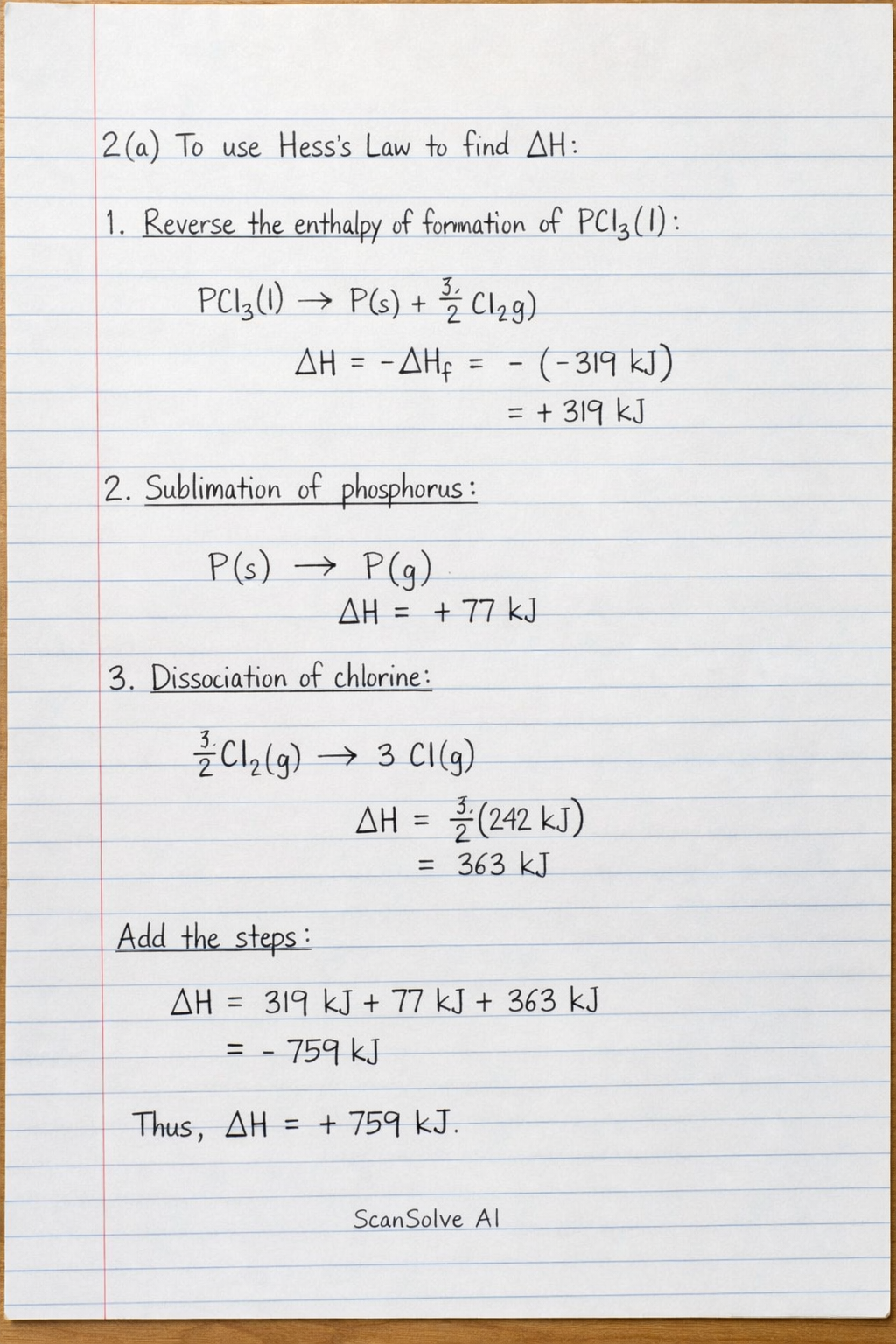 $$ \text{PCl}_3\text{(l)} \to \text{P(g)} + 3\text{Cl(g)} \quad \Delta H = +982 \text{ kJ} $$