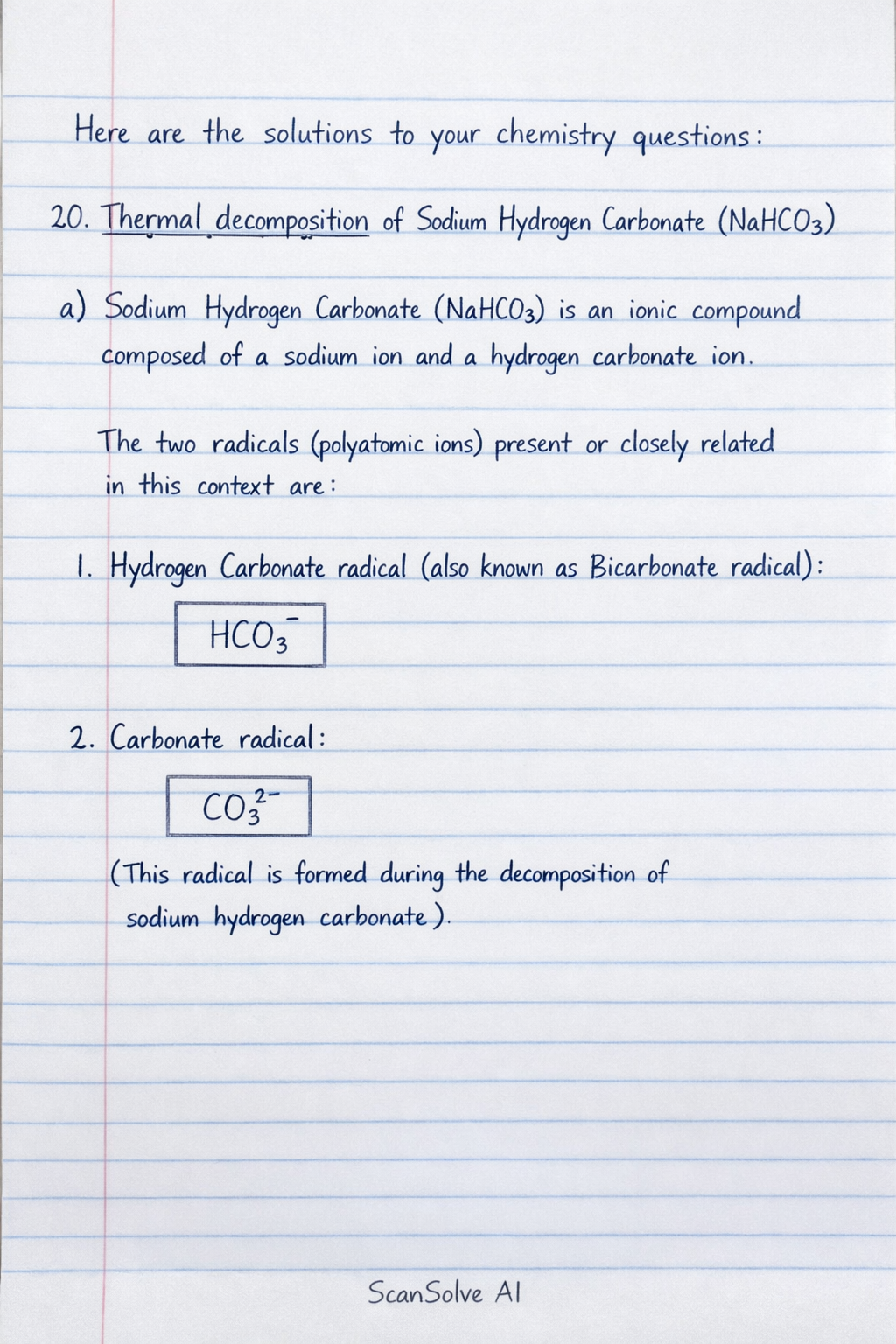 2. Carbonate radical: $\boxed{\text{CO}_3^{2-}}$ (This radical is formed during the decomposition of sodium hydrogen carbonate).