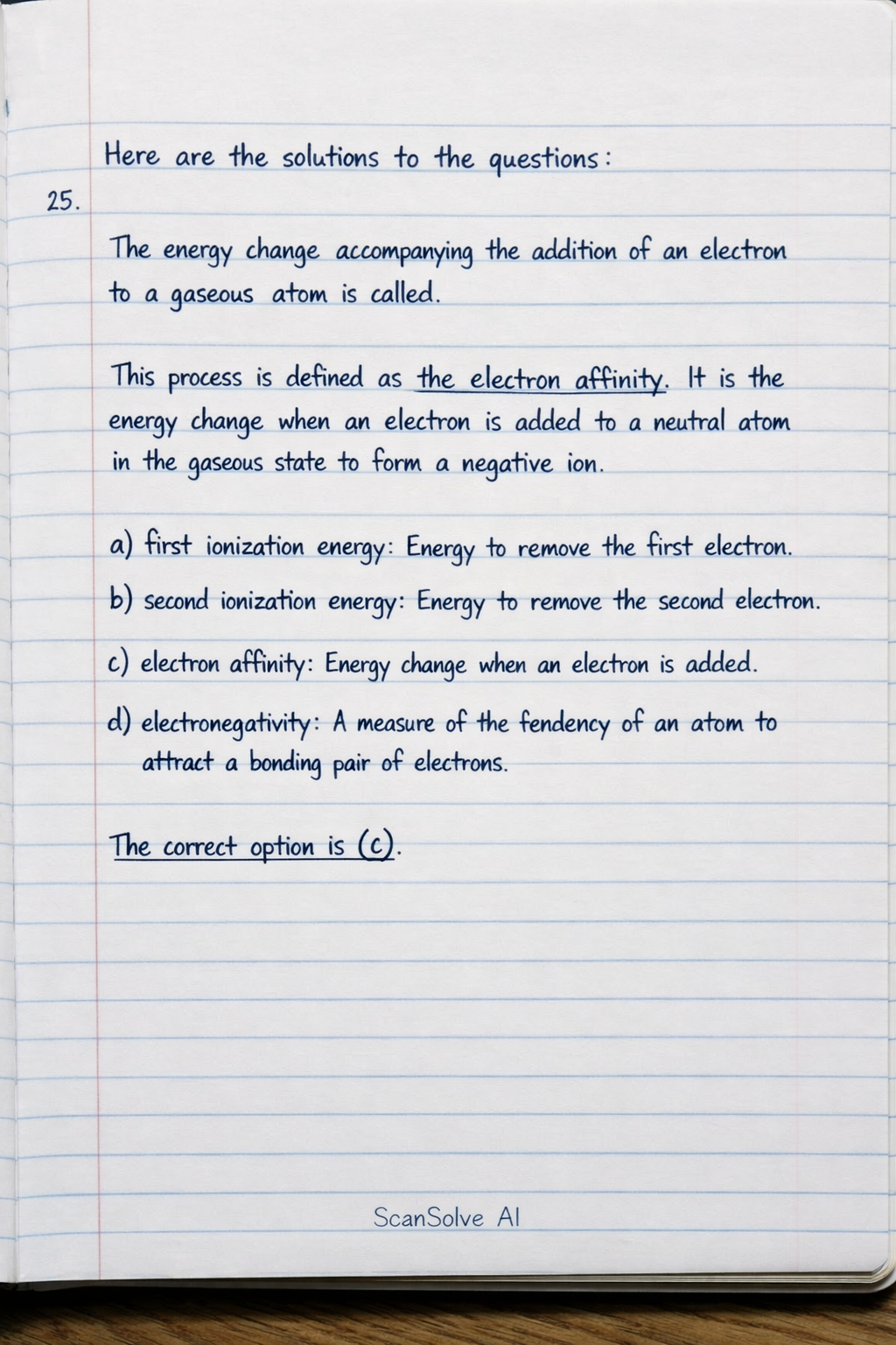25. The energy change accompanying the addition of an electron to a gaseous atom is called