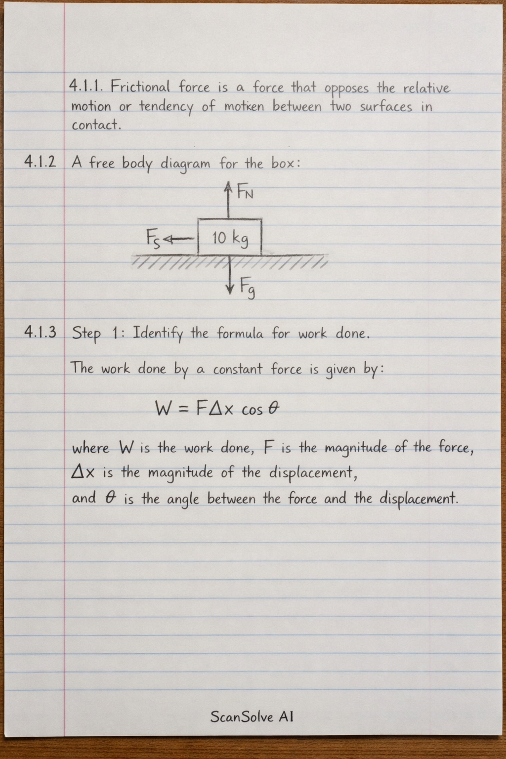 where W is the work done, F is the magnitude of the force, Δx is the magnitude of the displacement, and θ is the angle between the force and the displacement.