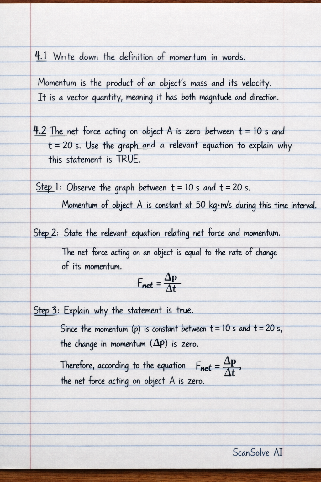 4.2 The net force acting on object A is zero between t=10 s and t=20 s. Use the graph and a relevant equation to explain why this statement is TRUE.