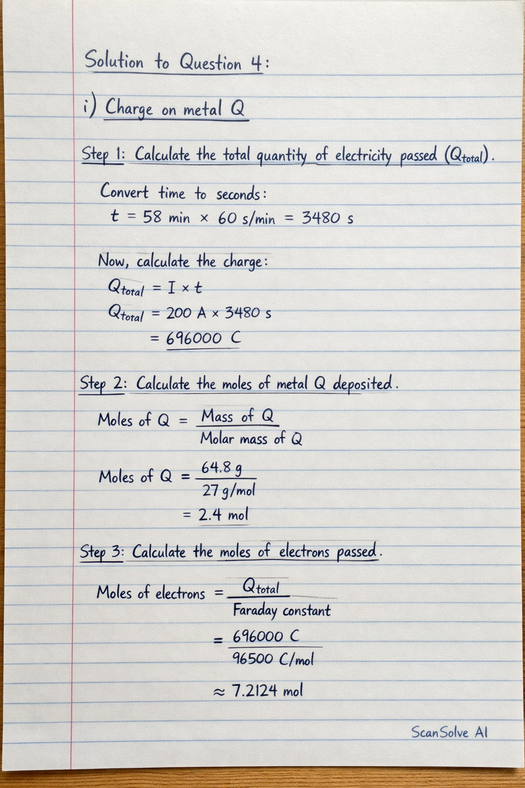 4. In an electrolysis, a current of 200 A was passed through molten oxide of metal Q for 58 minutes and 64.8 g of the metal deposited. Determine: