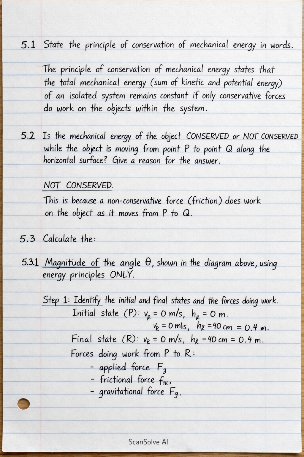 5.3.1 Magnitude of the angle θ, shown in the diagram above, using energy principles ONLY.