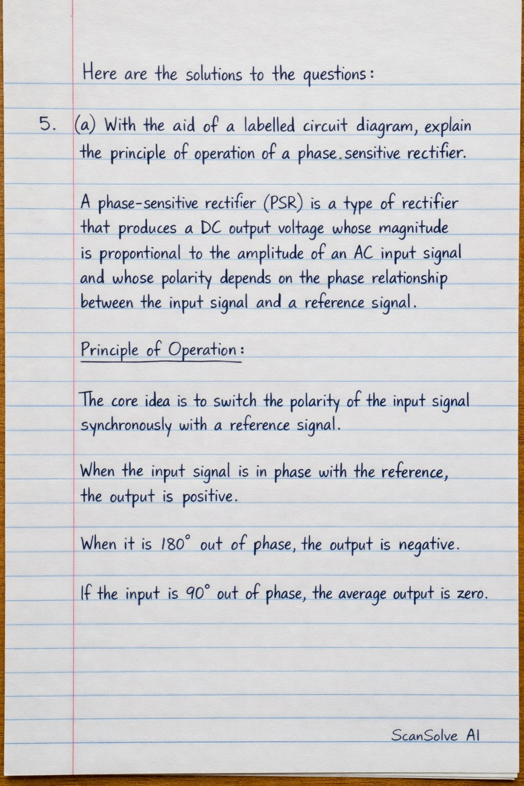 5. (a) With the aid of a labelled circuit diagram, explain the principle of operation of a phase sensitive rectifier.