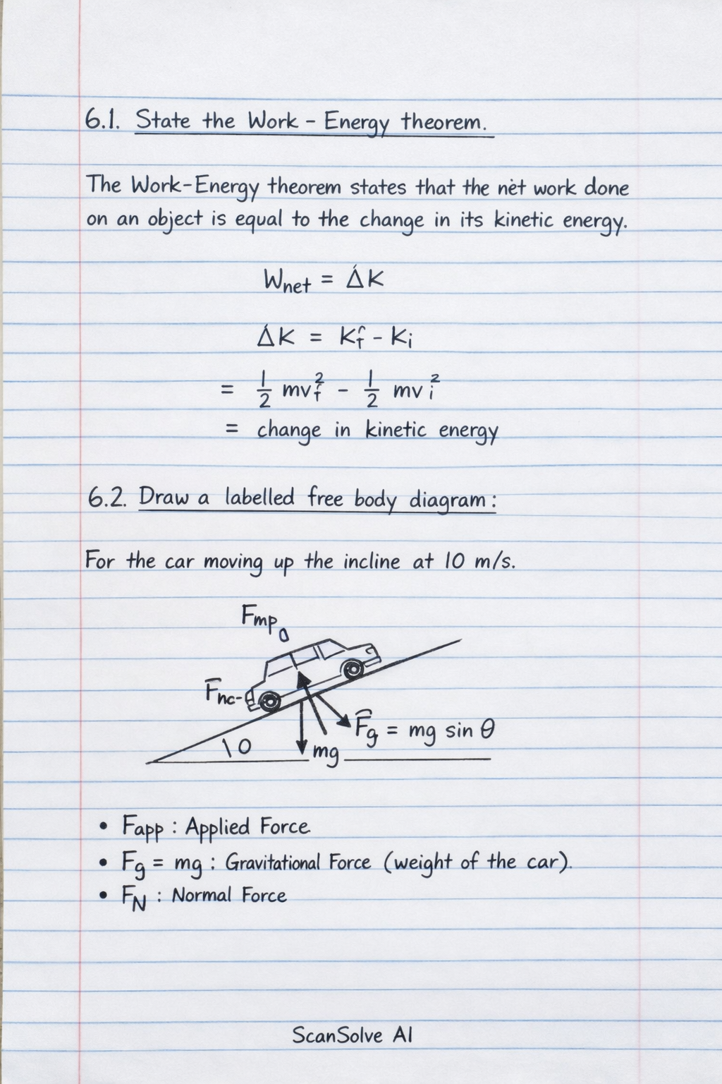6.2 Draw a labelled free body diagram to show all the focus acting on the car whilst it is moving up the incline with a constant speed of . The free body diagram for the car moving up the incline includes the following forces: • Applied Force (): The force exerted by the engine, acting parallel to the incline, upwards. • Gravitational Force ( or ): The weight of the car