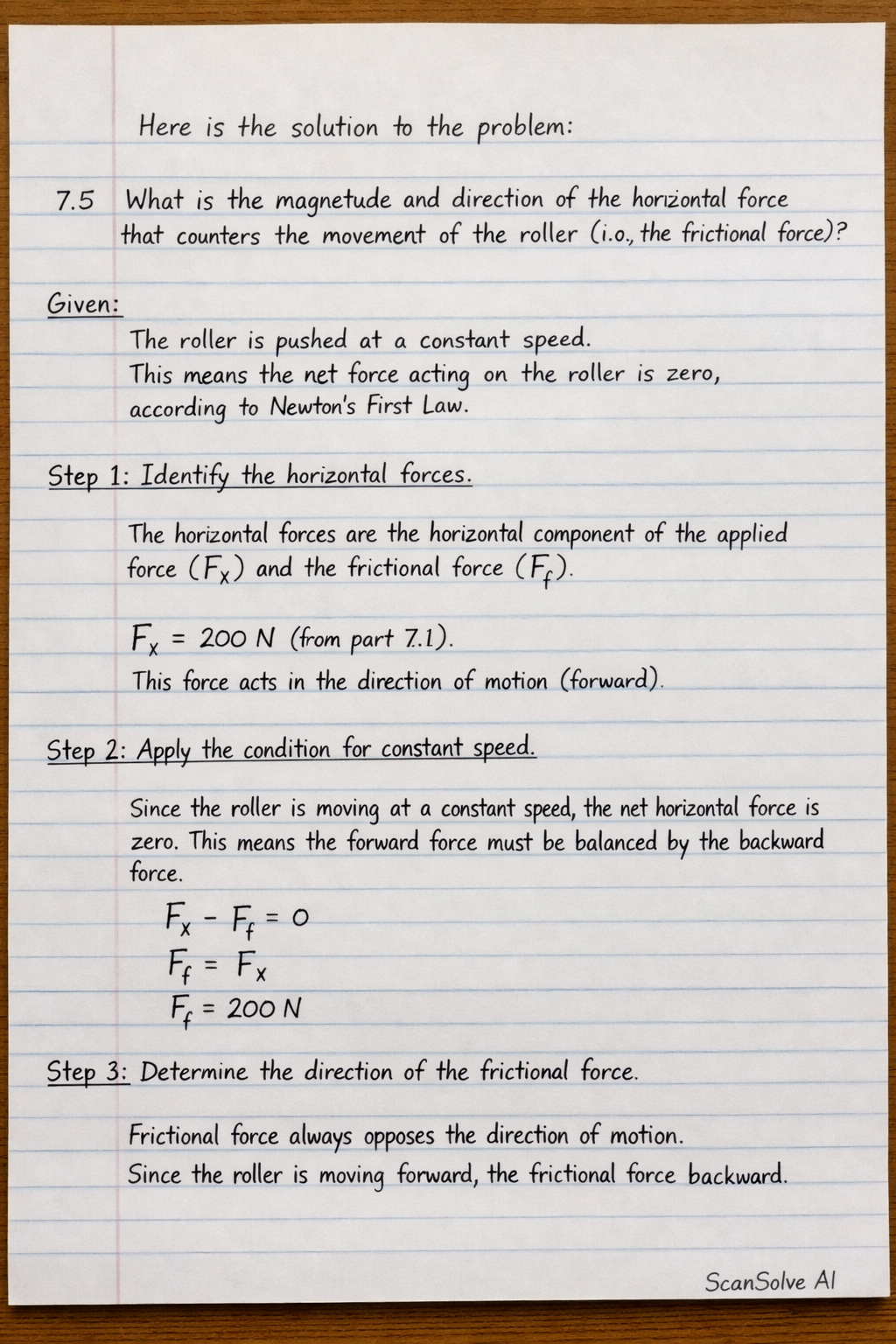 From part 7.1, the horizontal component of the applied force is Fx=200 N. This force acts in the direction of motion (forward).