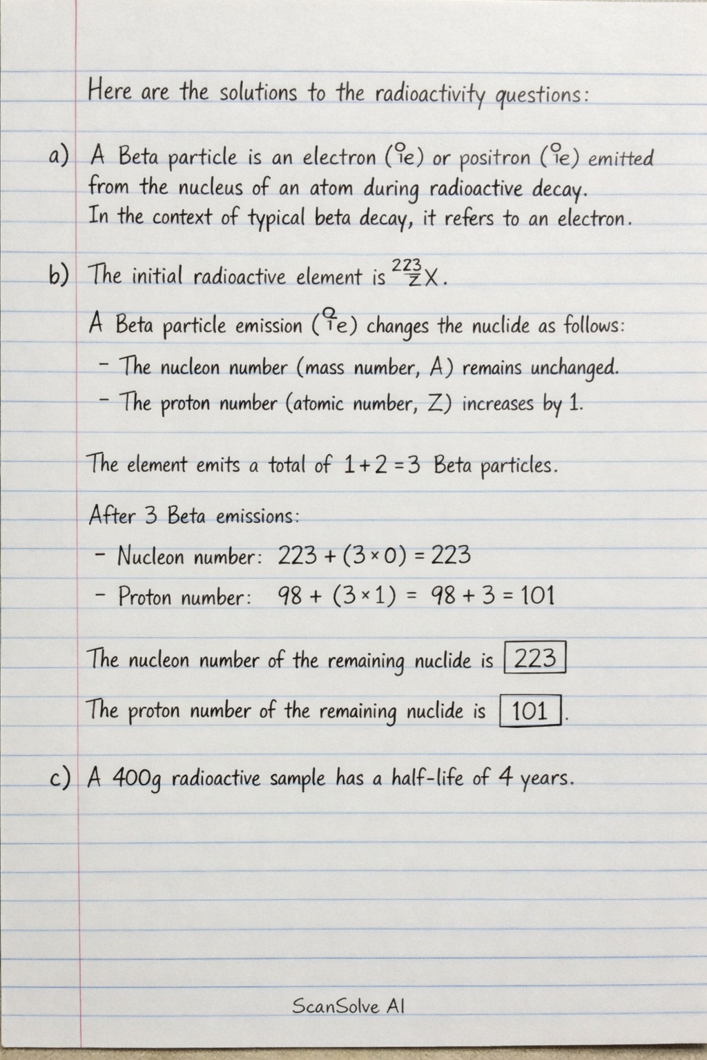 a) A Beta particle is an electron (−10e) or positron (+10e) emitted from the nucleus of an atom during radioactive decay. In the context of typical beta decay, it refers to an electron.