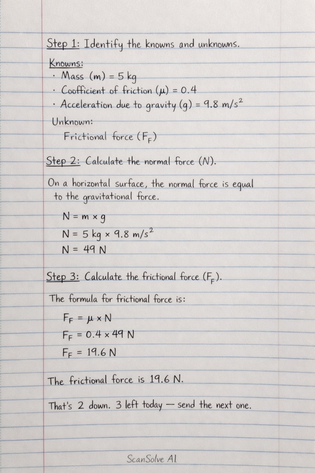 A block of mass 5kg rests on a horizontal surface the coefficient of friction The block & The surface is o.4. Find the frictional force (take g=9.8m/s square