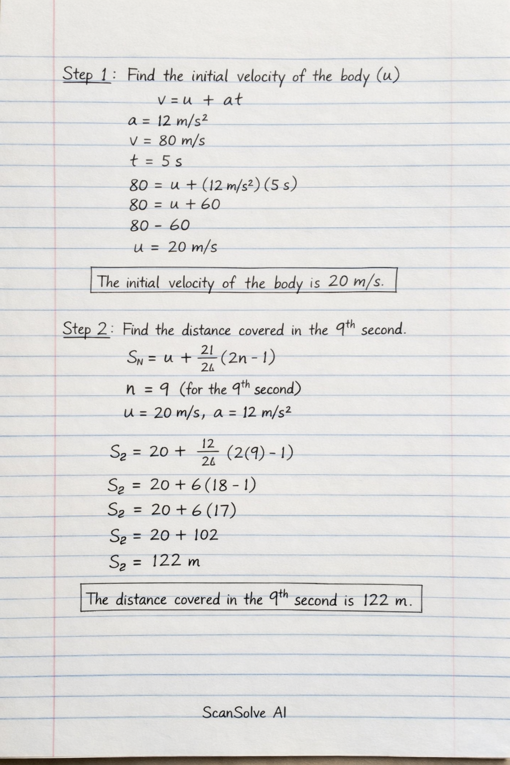 We use the initial velocity u=20m/s (found in Step 1) and the acceleration a=12m/s2.