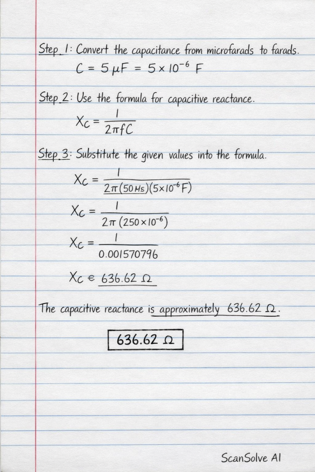 $$ X_C = \frac{1}{2 \pi (50 \text{ Hz}) (5 \times 10^{-6} \text{ F})} $$