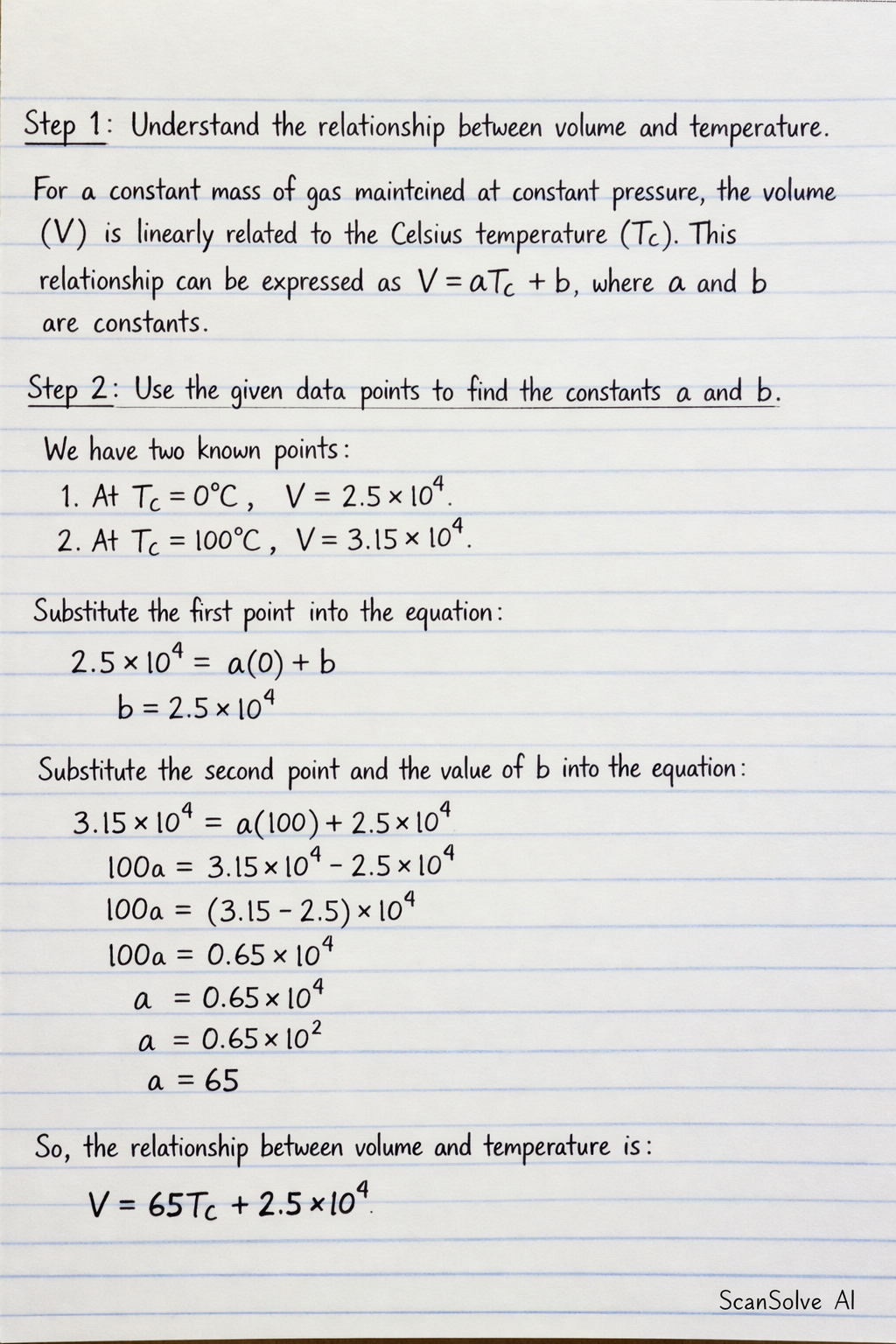 For a constant mass of gas maintained at constant pressure, the volume (V) is linearly related to the Celsius temperature (TC). This relationship can be expressed as V=aTC+b, where a and b are constants.