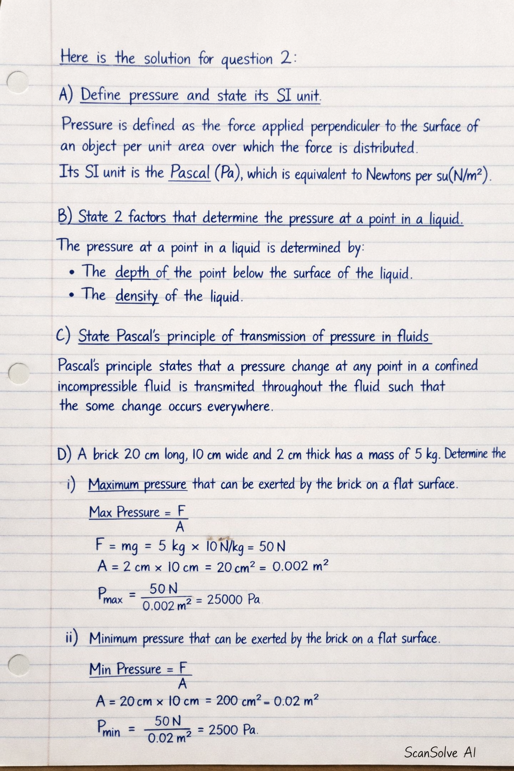 D) A brick 20 cm long, 10 cm wide and 2 cm thick has a mass of 5 kg. Determine the i) Maximum pressure that can be exerted by the brick on a flat surface. ii) Minimum pressure that can be exerted by the brick on a flat surface. (g = 10N/kg)