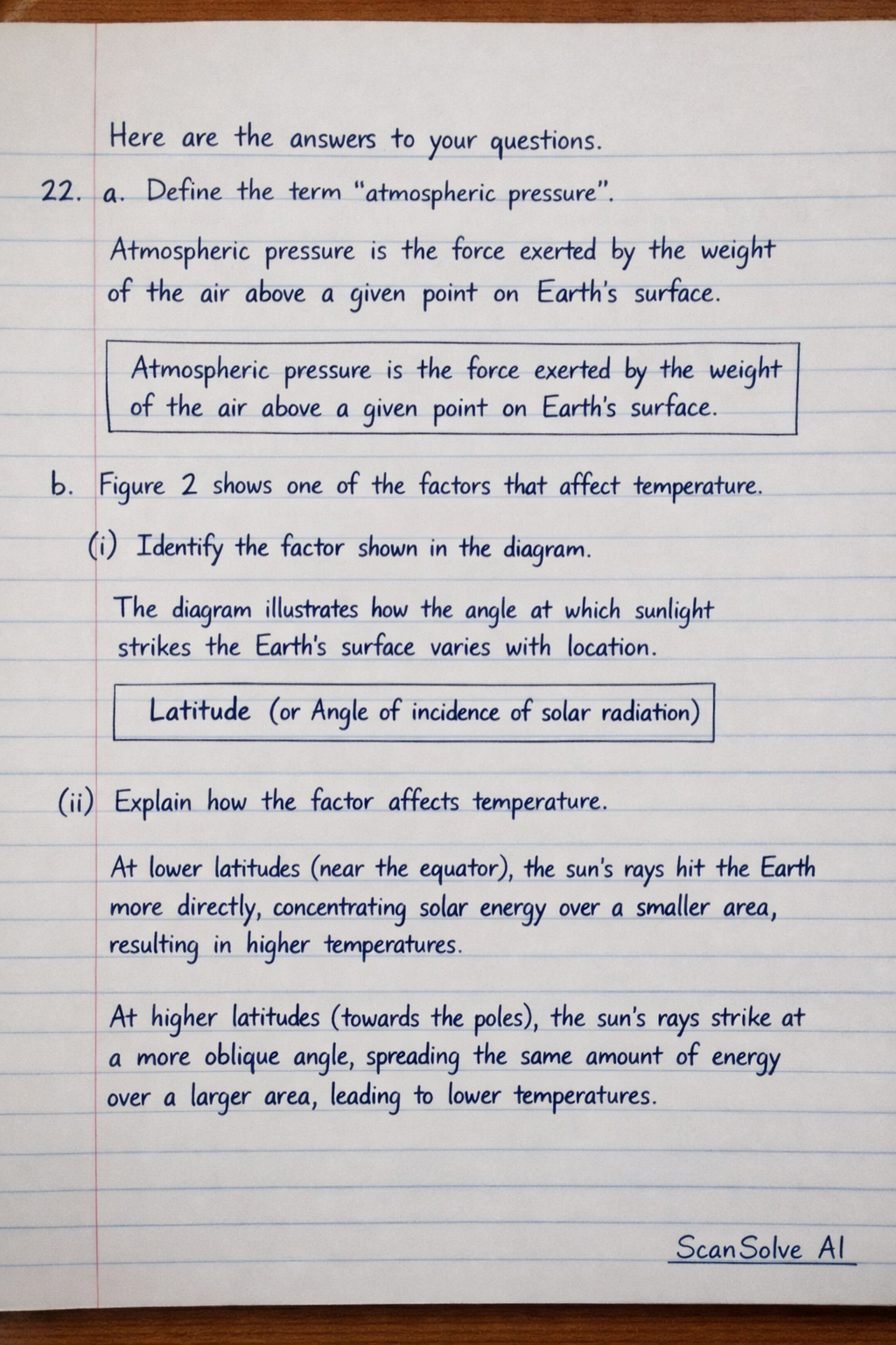 (ii) Explain how the factor affects temperature At lower latitudes (near the equator), the sun's rays hit the Earth more directly, concentrating solar energy over a smaller area, which results in higher temperatures. At higher latitudes (towards the poles), the sun's rays strike at a more oblique angle, spreading the same amount of energy over a larger area, leading to lower temperatures.