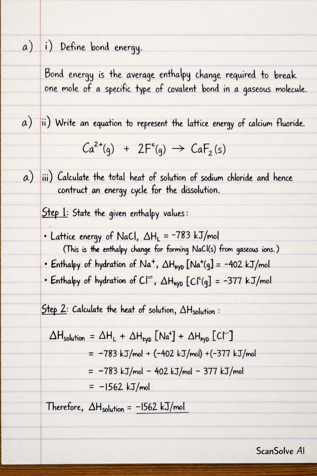 a) iii) Calculate the total heat of solution of sodium chloride and hence construct an energy cycle for the dissolution. Step 1: State the given enthalpy values.