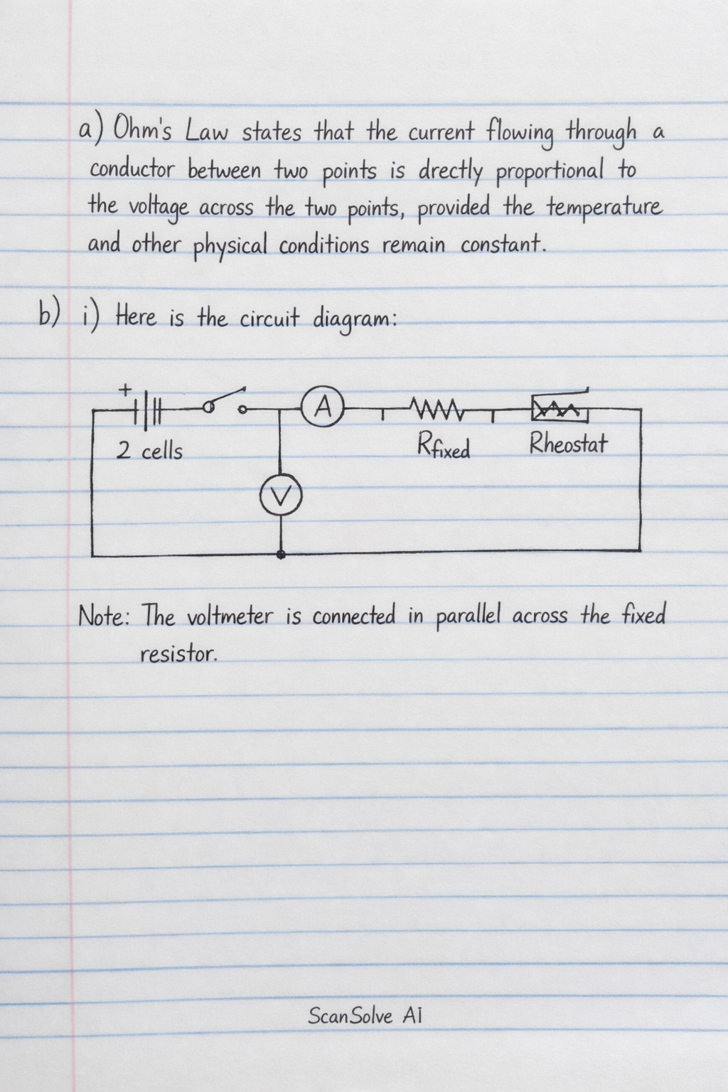 \begin{circuitikz} \draw (0,0) to[battery, l_=$2 \text{ cells}$] (0,2) to[switch] (2,2) to[ammeter, l_=$A$] (4,2) to[R, l_=$R_{fixed}$] (6,2) to[variable resistor, l_=$Rheostat$] (8,2) to (8,0) to (0,0) (4,2) to[open, v_=$V$] (4,0); \end{circuitikz}Note: The voltmeter is connected in parallel across the fixed resistor.