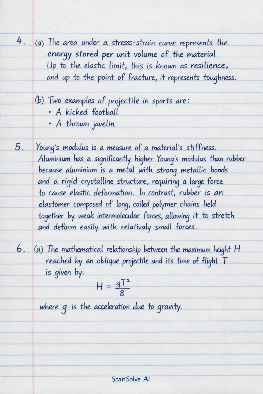 4.a) The area under a stress-strain curve represents the energy stored per unit volume of the material. Up to the elastic limit, this is known as resilience, and up to the point of fracture, it represents toughness.