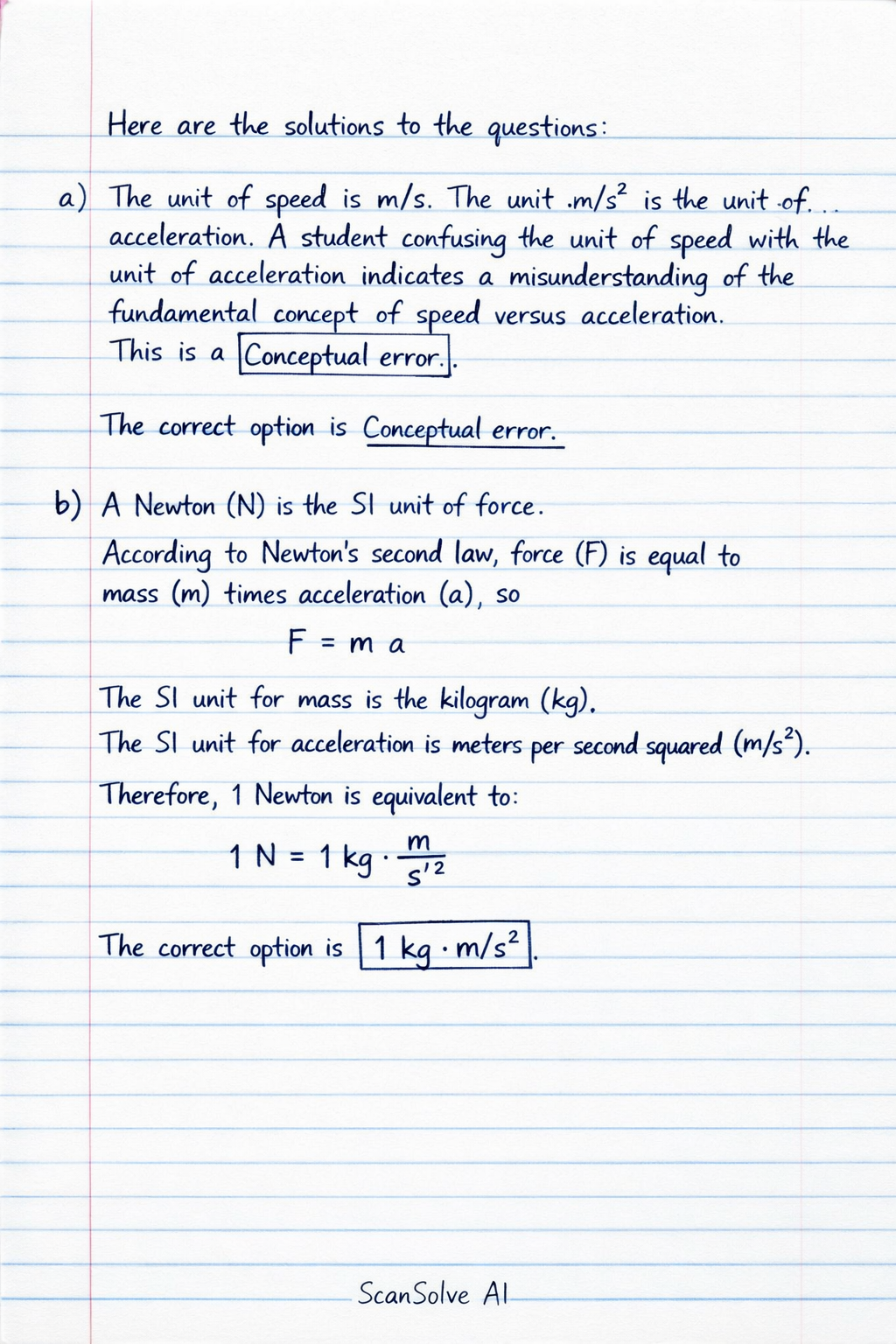 a) The unit of speed is m/s. The unit m/s2 is the unit of acceleration. A student confusing the unit of speed with the unit of acceleration indicates a misunderstanding of the fundamental concept of speed versus acceleration. This is a conceptual error.
