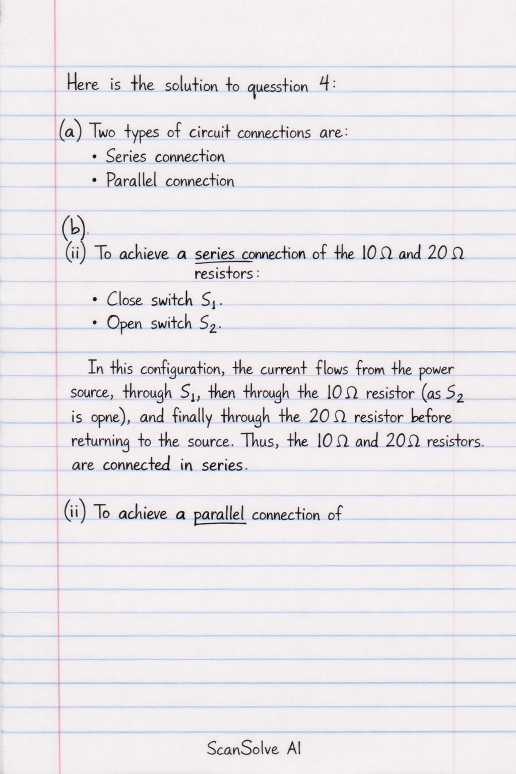 b) i) To achieve a series connection of the 10 and 20 resistors: • Close switch S1. • Open switch S2. In this configuration, the current flows from the power source, through S1, then through the 10 resistor (as S2 is open), and finally through the 20 resistor before returning to the source. Thus, the 10 and 20 resistors are connected in series.