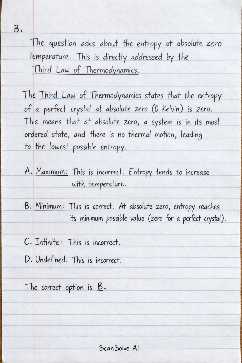 - B. Minimum: This is correct. At absolute zero, entropy reaches its minimum possible value (zero for a perfect crystal).