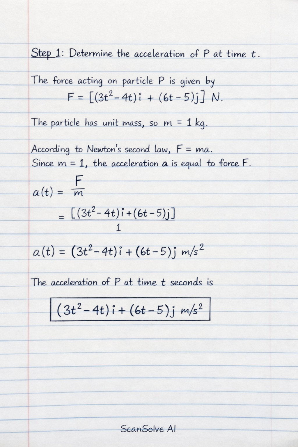 $$a(t) = \frac{F}{m} = \frac{[(3t^2 - 4t)i + (6t - 5)j]}{1}$$