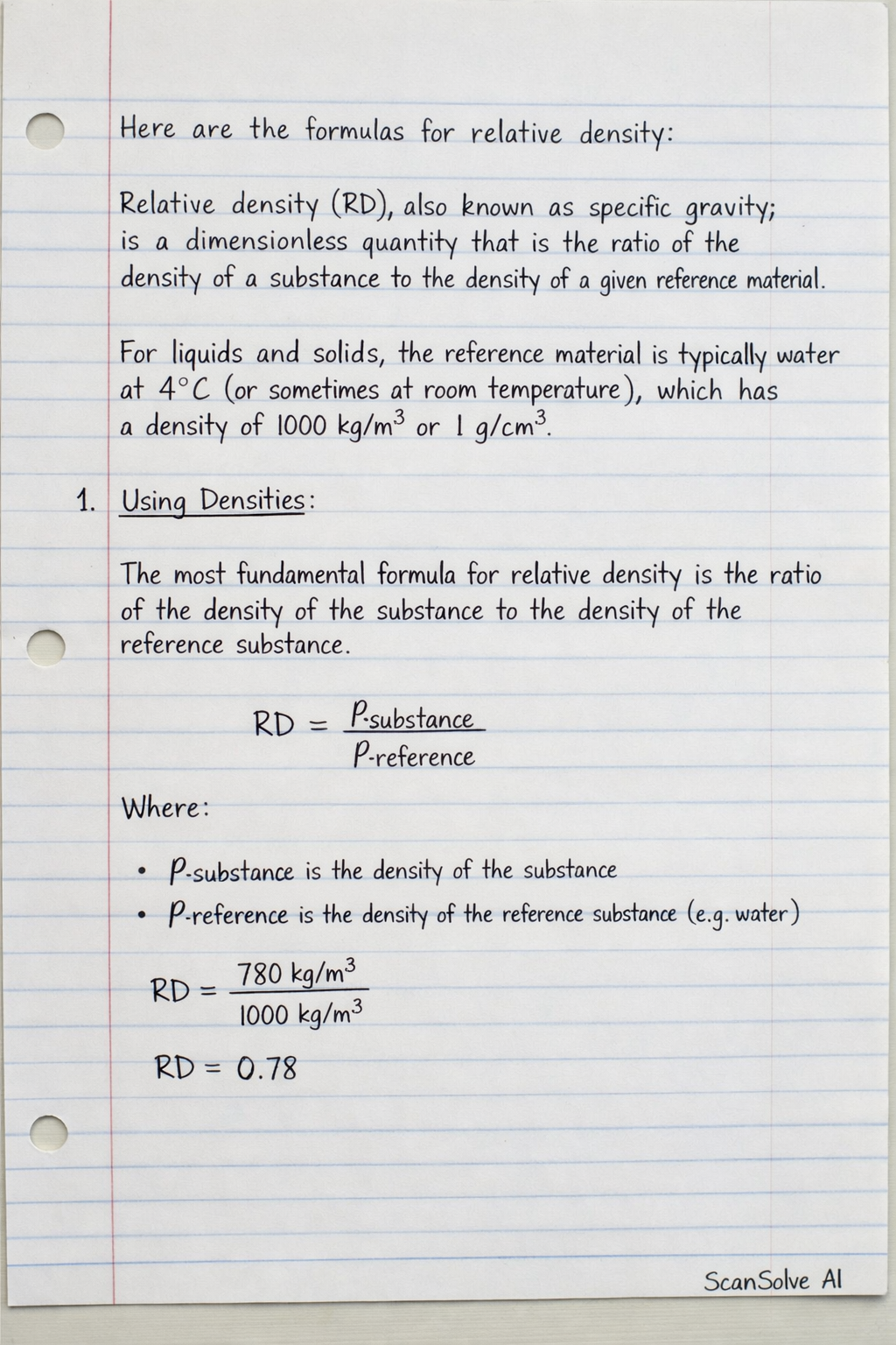 Using Masses (for equal volumes): Since density () is mass () divided by volume (), if we consider equal volumes of the substance and the reference material, the formula can be expressed in terms of mass: Where: • is the mass of a certain volume of the substance • is the mass of an equal volume of the reference substance