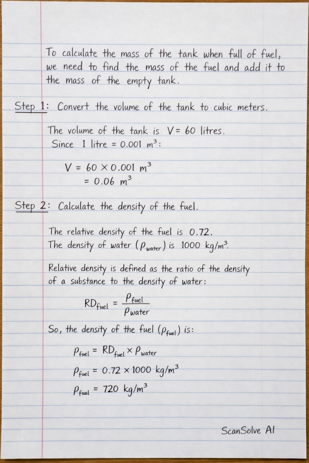 To calculate the mass of the tank when full of fuel, we need to find the mass of the fuel and add it to the mass of the empty tank.