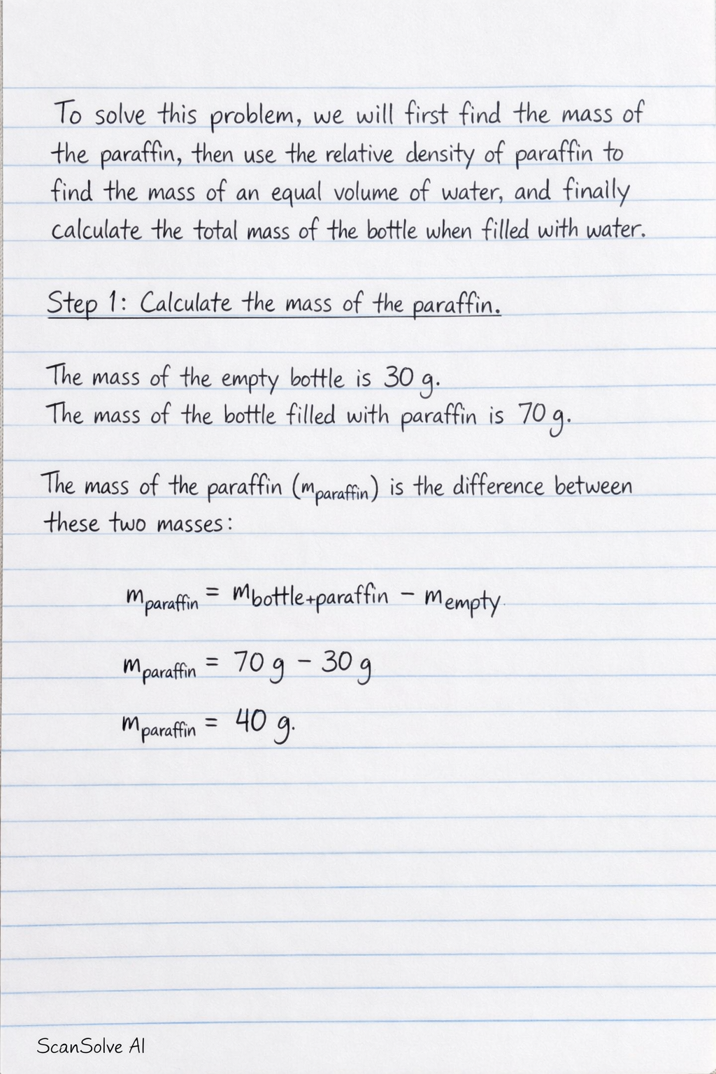 Step 2: Use the relative density of paraffin to find the mass of an equal volume of water.