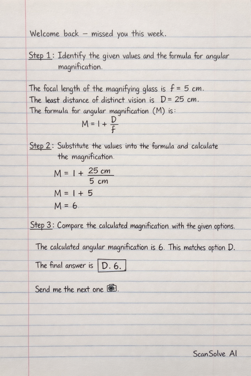 The calculated angular magnification is 6. This matches option D.