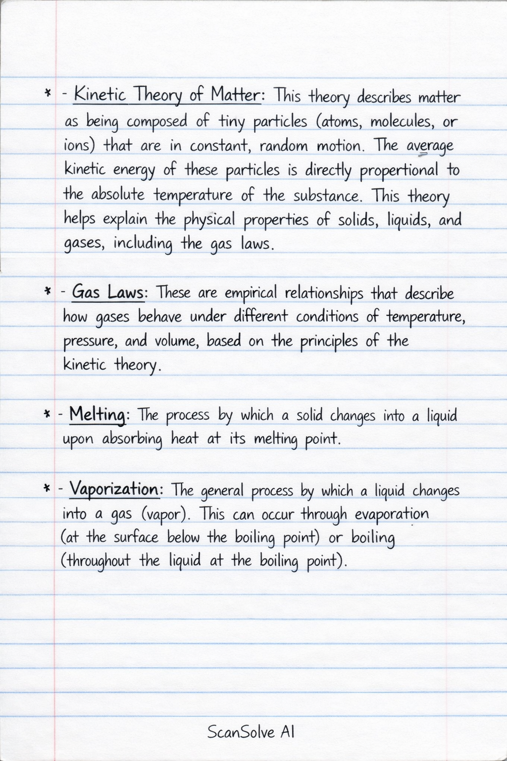 Gas Laws: These are empirical relationships that describe how gases behave under different conditions of temperature, pressure, and volume, based on the principles of the kinetic theory.