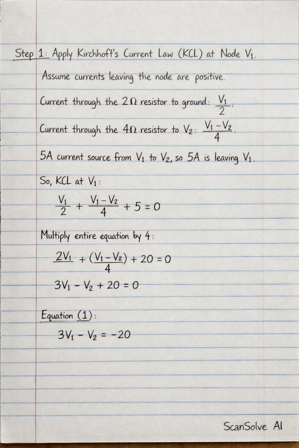 Step 1: Apply Kirchhoff's Current Law (KCL) at Node V1.