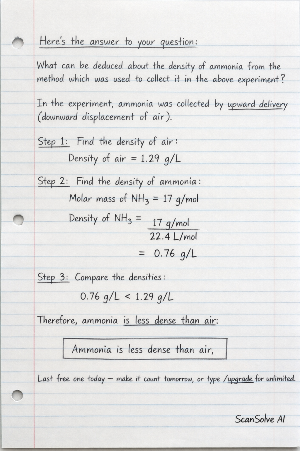 Here's the answer to your question: What can be deduced about the density of ammonia from the method which was used to collect it in the above experiment? In the previous context, ammonia was collected by upward delivery (also known as downward displa…