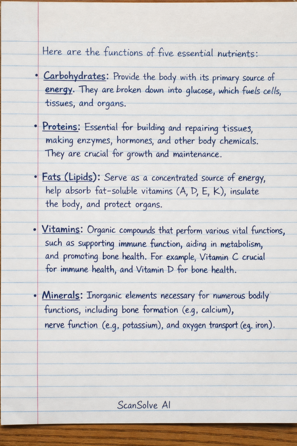 Here are the functions of five essential nutrients: